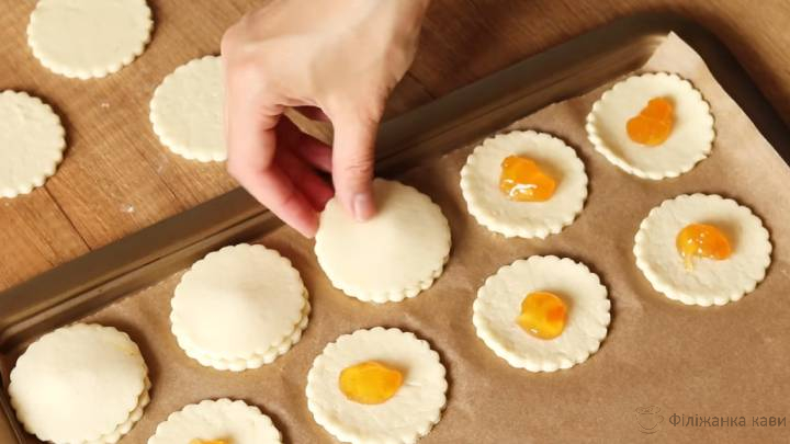 Половину кружків перекласти на форму, вистелену пергаментною папером. Мастити маслом не потрібно. У кожний кружок покласти 0,5 ч. л. джему чи варення за смаком. Закрити другою половинкою.