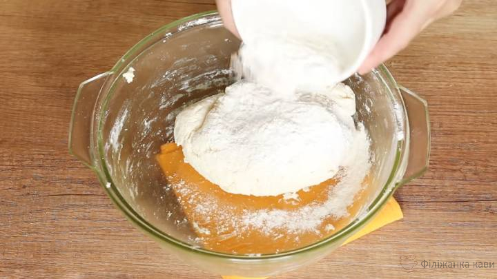 Сир з’єднати з розм’якшеним вершковим маслом та цукром. Всипати 2/3 частини борошна з розпушувачем, замісіть тісто. Потім, підсипаючи борошно, що залишилося, замісіть середнє по щільності тісто руками.