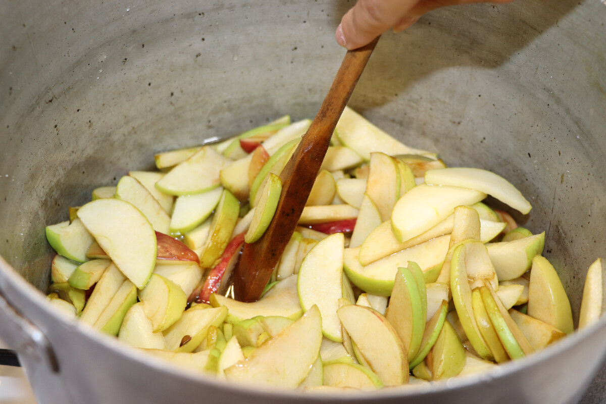 2. У каструлю до яблук пересипаю цукор. Перемішую все. Залишаю яблука в цукрі на годину.