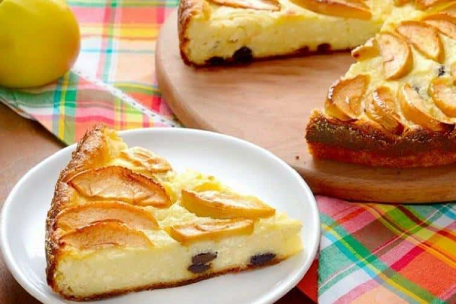 Приготування: родзинки промий кип’ятком і обсуши. Яблука наріж на часточки. Змішай сир, сіль, манну крупу, родзинки, ванілін і збиті з цукром яйця. Залиш тісто на 10 хвилин, щоб манка розбухла. Вилий масу в змащену форму, зверху розклади яблука і присип корицею. Випікати запіканку 30 хвилин при температурі 180 градусів.