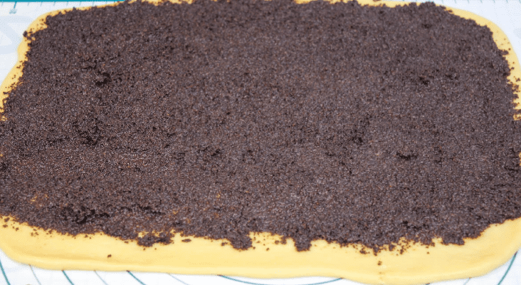 - Кожну частину тіста розкачати в прямокутник (28х36), товщиною приблизно 2-3 мл. На кожну частину тіста розподілити рівномірно макову начинку (начинку ділимо навпіл), далекий край залишити, 1,5-2 см., його не змащувати.