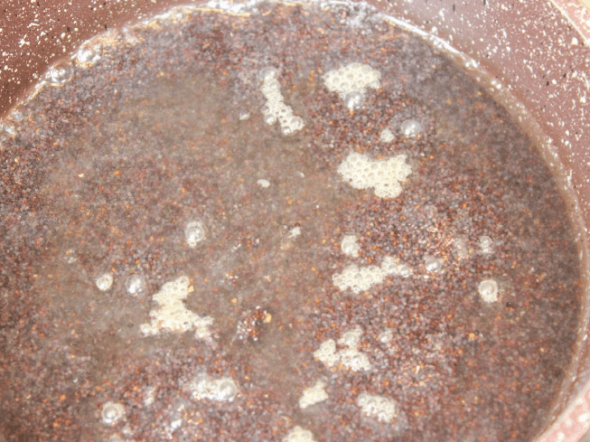 - Залити чистий мак водою (пропорція 1:1). Ставимо сотейник на плиту, доводимо до кипіння, знімаємо пінку, прикриваємо кришкою, зменшуємо вогонь на мінімальний, щоб ледве булькало. Варимо до моменту, поки вся рідина випарується і мак добре розпариться приблизно на це іде 15-20 хвилин, періодично помішуючи, щоб мак не пригорів.