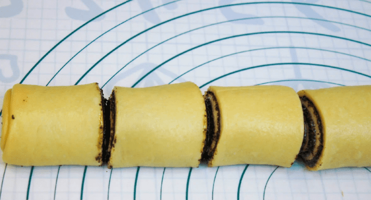- Тісто згорнути у рулет, защипнути край рулету. Нарізати рулет на рівні частини по 5-6 см. на 6 шматочків.