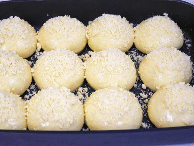 Форму змащуємо олією та укладаємо майбутні булочки. Накриваємо плівкою та залишаємо ще хвилин на 30-40, для підйому.