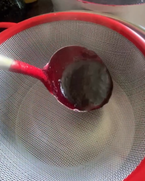 Відразу ж протріть через сито. Поставте сито над іншою каструлею, щоб стікав сік для желе. Сік вже досить густий – пектин при активному кипінні швидко починає працювати, а його в смородині дуже багато.