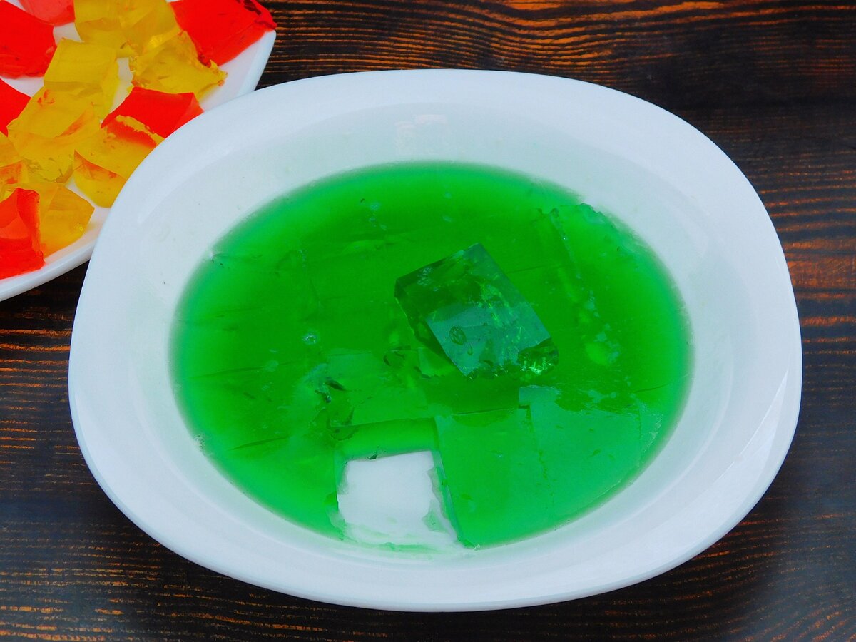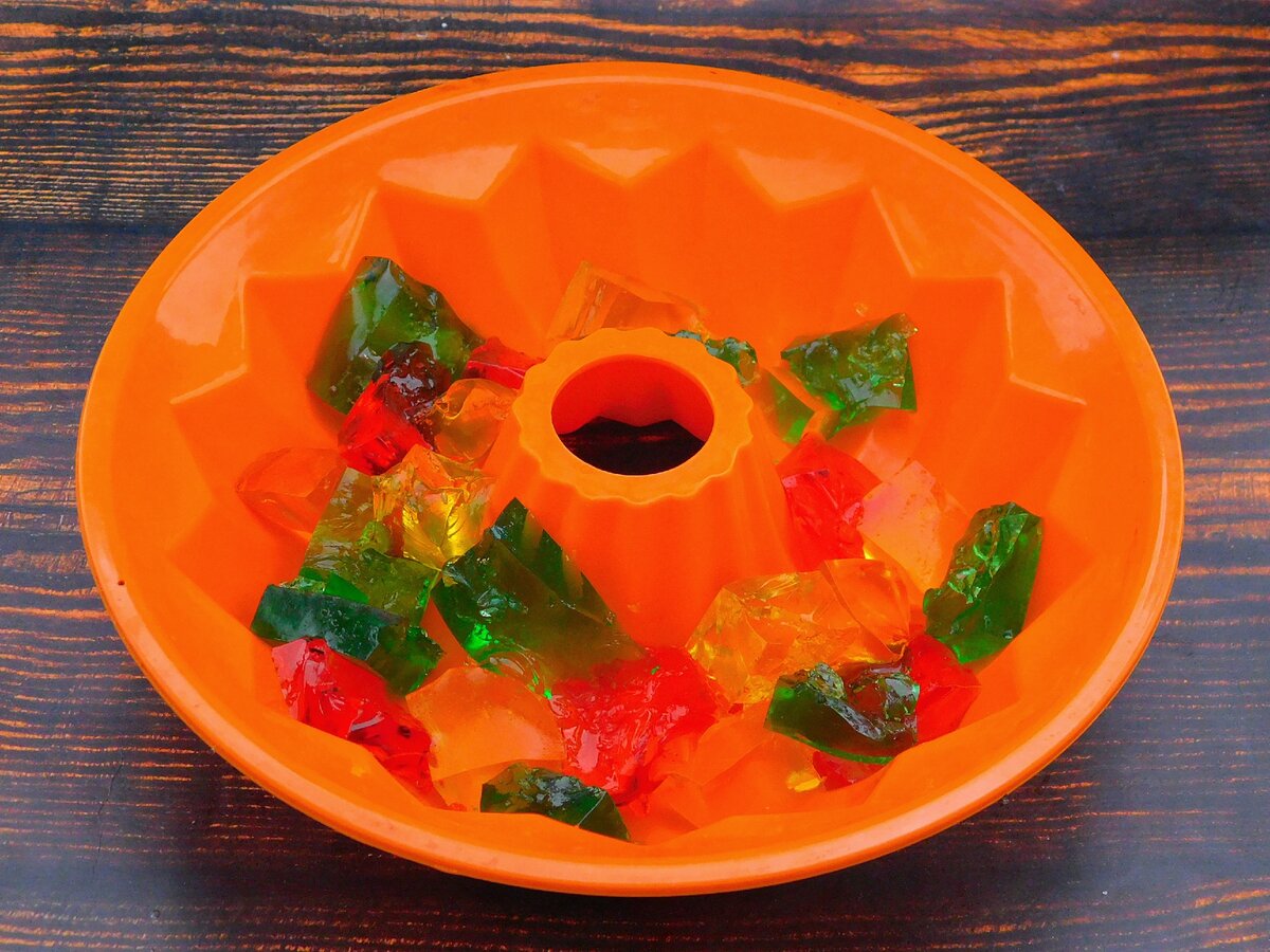 Збирати торт “Бито скло” найзручніше в силіконовій формі. Також можна взяти куполоподібну миску. На дно викласти шар желатинових шматочків.