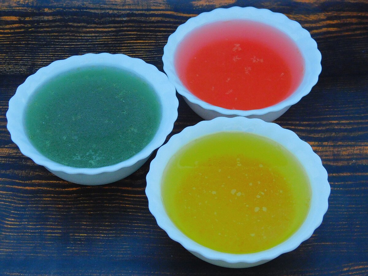 Підготувати все необхідне. Желе брати різних кольорів. Висипати порошок в підходящі мисочки.