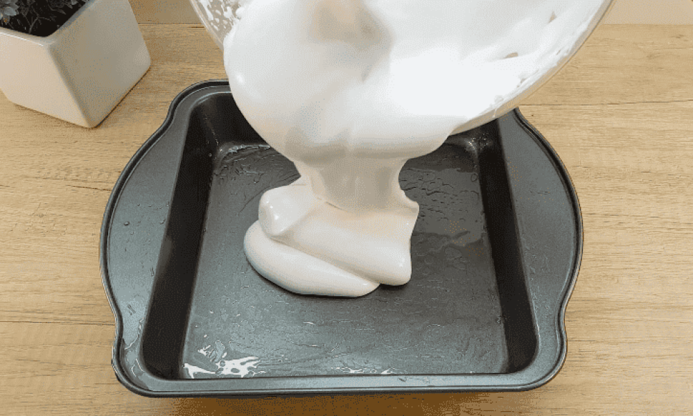 Як тільки суміш стане білою і в’язкою, відразу лийте у форму 1/2 частини
