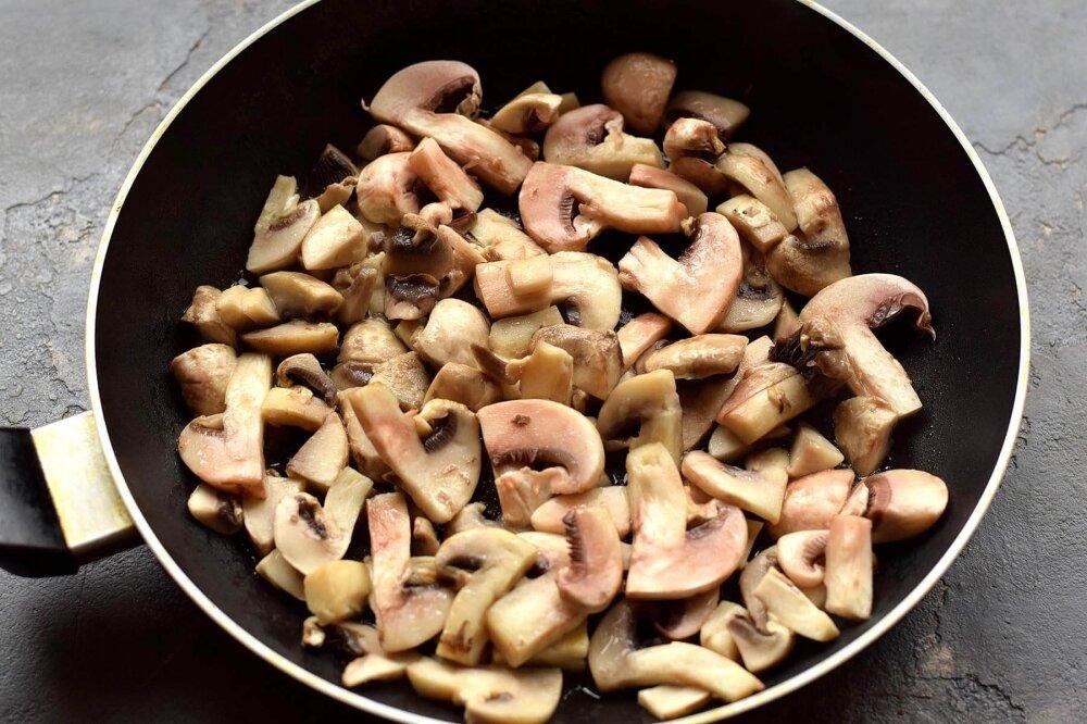 - Гриби обполосніть, наріжте пластинками, відправте на суху розігріту сковороду. Тушіть до повного випаровування грибного соку, після влийте олію.