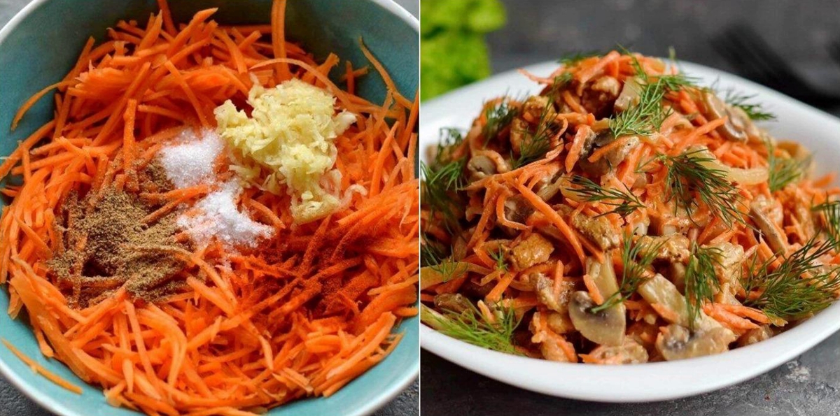 - В першу чергу приготуйте моркву по-корейськи, щоб вона встигла промаринуватися. Моркву очистіть, натріть на спеціальній терці, довгі смужки розріжте на кілька частин, вивантажите в глибоку ємність. Додайте всі зазначені спеції, видавіть зубочки часнику, влийте оцет.