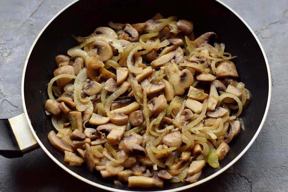 - Цибулю наріжте тонкими напівкільцями, закиньте до грибів, перемішайте. Суміш посоліть, тушкуйте до готовності приблизно 5 хвилин, періодично перемішуючи. Гриби і цибулю перекладіть на серветку.