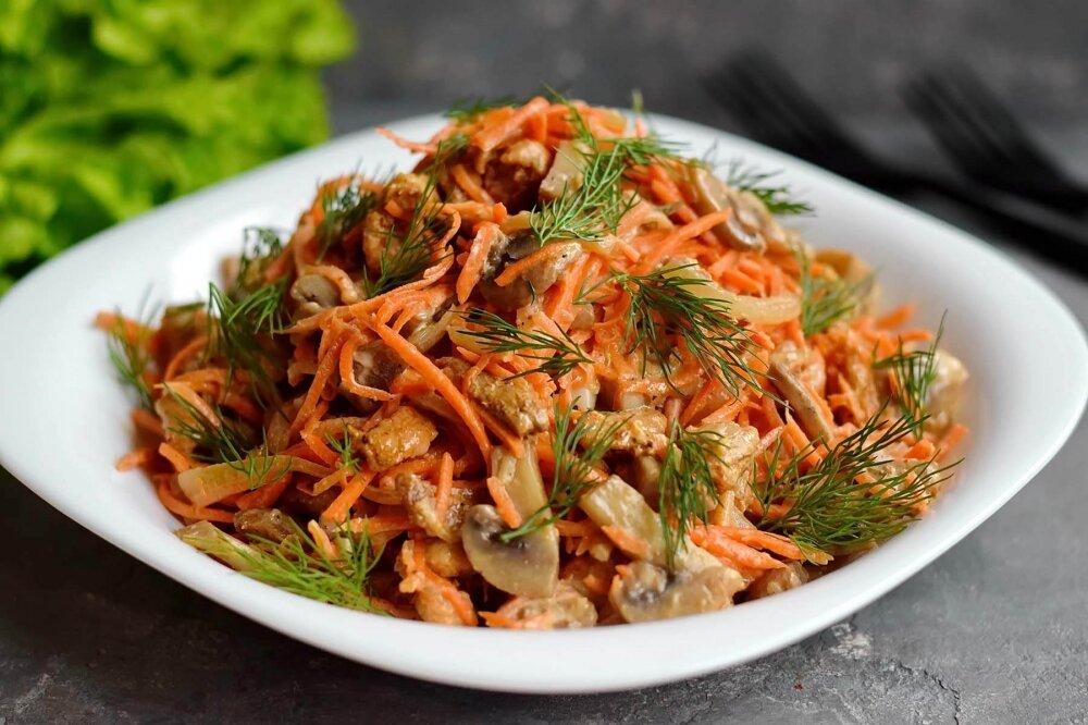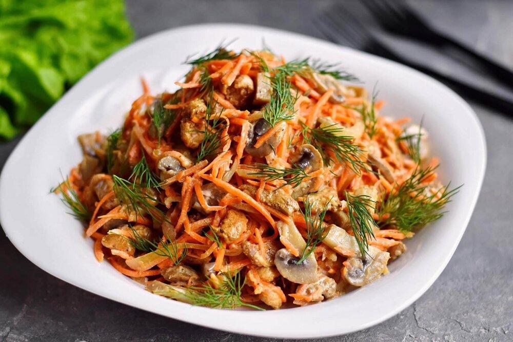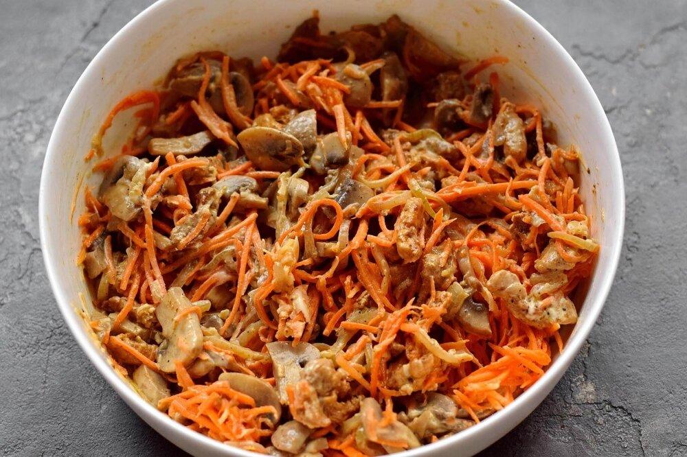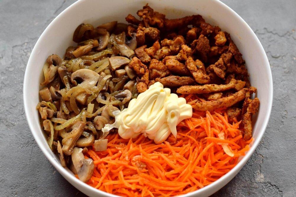 - Всі підготовлені інгредієнти вивантажите в одну ємність, додайте майонез. Моркву обов’язково процідити від маринаду.