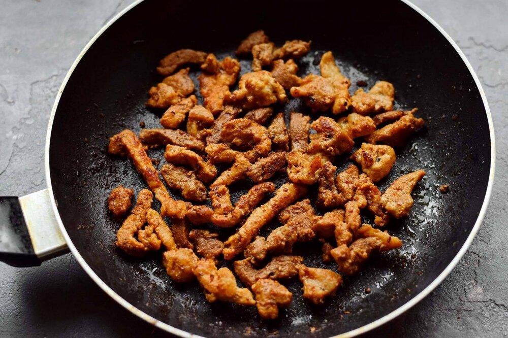 - М’ясо наріжте тонкими смужками, закиньте на гарячу оліййну поверхню сковороди. Смажте його до готовності, в кінці посоліть і поперчіте. Після смаження м’ясо викладіть на паперовий рушник, щоб воно ввібрало зайву олію.