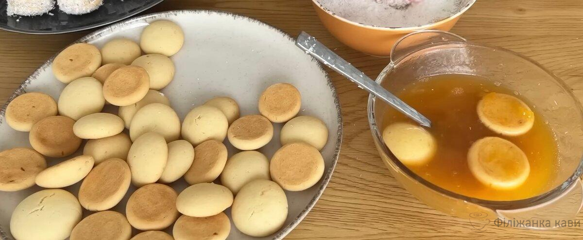 Варення трохи розводимо водою і занурюємо печиво. Одну складаємо на іншу і обсипаємо кокосовою стружкою.